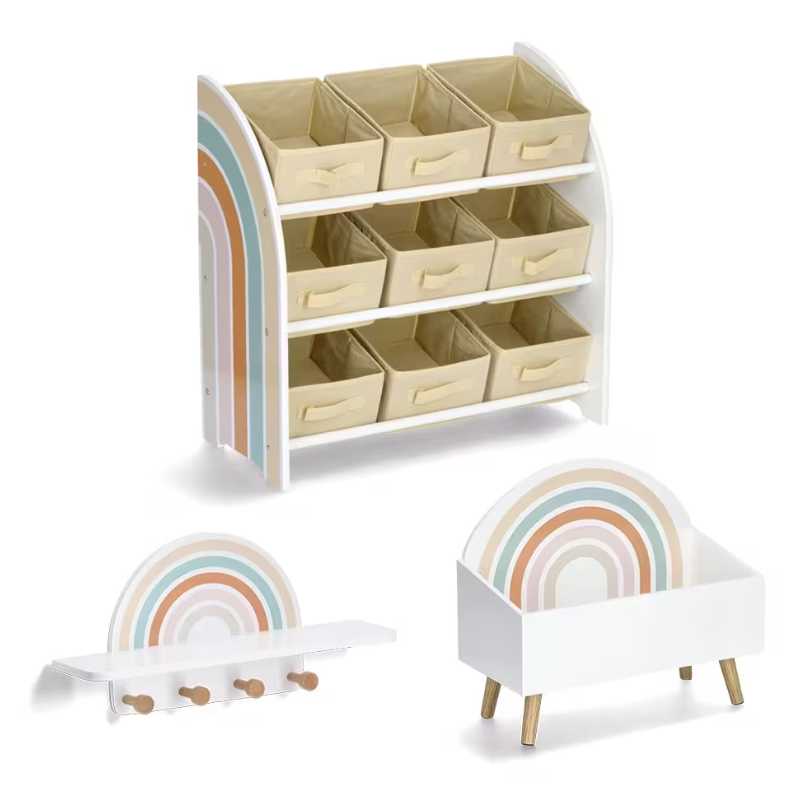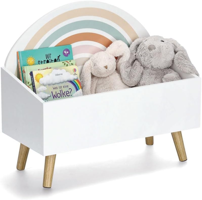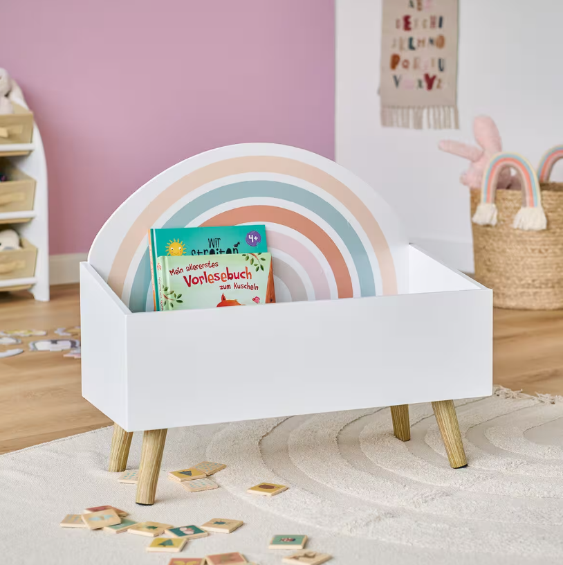 Trocha chaosu v dětském pokoji je naprosto normální. Naše dětská úložná truhla je perfektním řešením pro udržení pořádku. S rozměry přibližně 58 x 28 x 52 cm nabízí dostatek prostoru pro každou plyšovou hračku. Jednoduchý duhový design doplní každý dětský pokoj. Nabízíme také další drobné kusy nábytku ve stejném stylu!