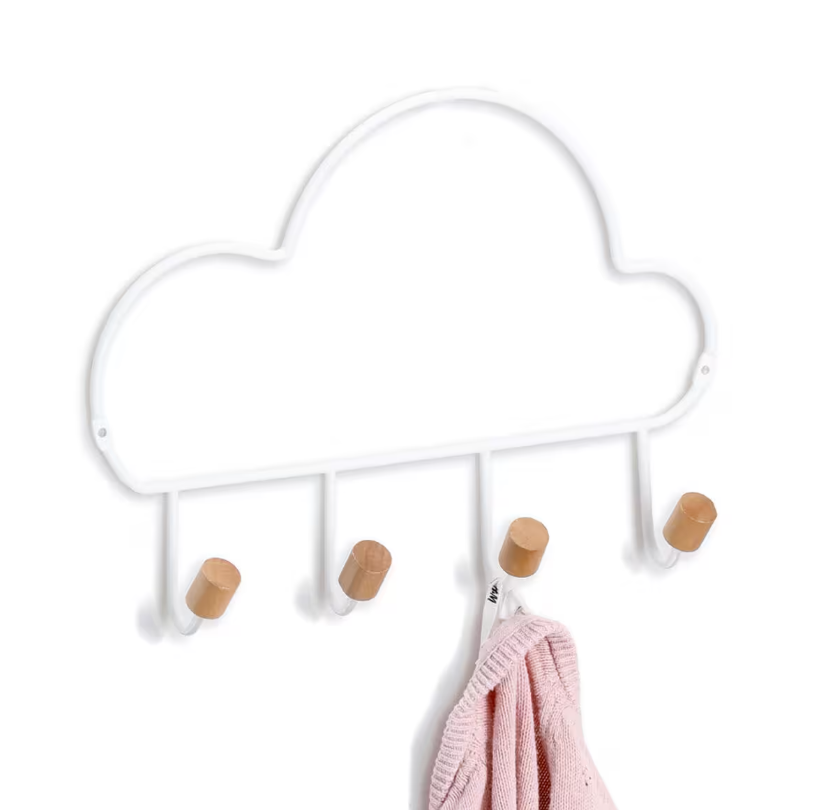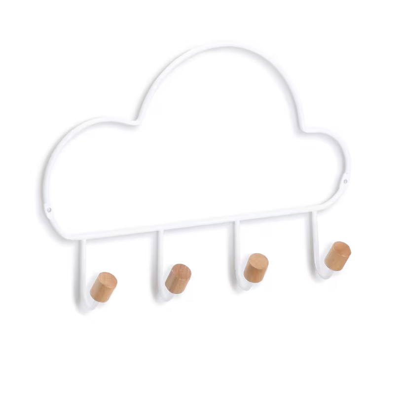 Pro oživení dětského pokoje a rychlé nalezení často používaných věcí, jako jsou bundy a čepice, je náš věšák s háčky v designu „Mráček“ perfektní volbou. Čtyři háčky s dřevěnými konci udržují věci uklizené a zabraňují sklouzávání předmětů.