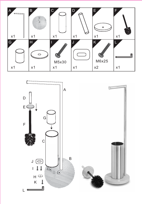 Tato kovová stylová toaletní sada v nerez provedení kombinuje funkčnost s moderním designem. Díky integrovanému držáku toaletního papíru a praktickému toaletnímu kartáči nabízí vše, co potřebujete pro svou koupelnu. Robustní základna zajišťuje stabilitu, zatímco minimalistický design harmonicky zapadne do jakéhokoli koupelnového zařízení. Tato toaletní sada je perfektní volbou pro elegantní a dobře organizovanou koupelnu.