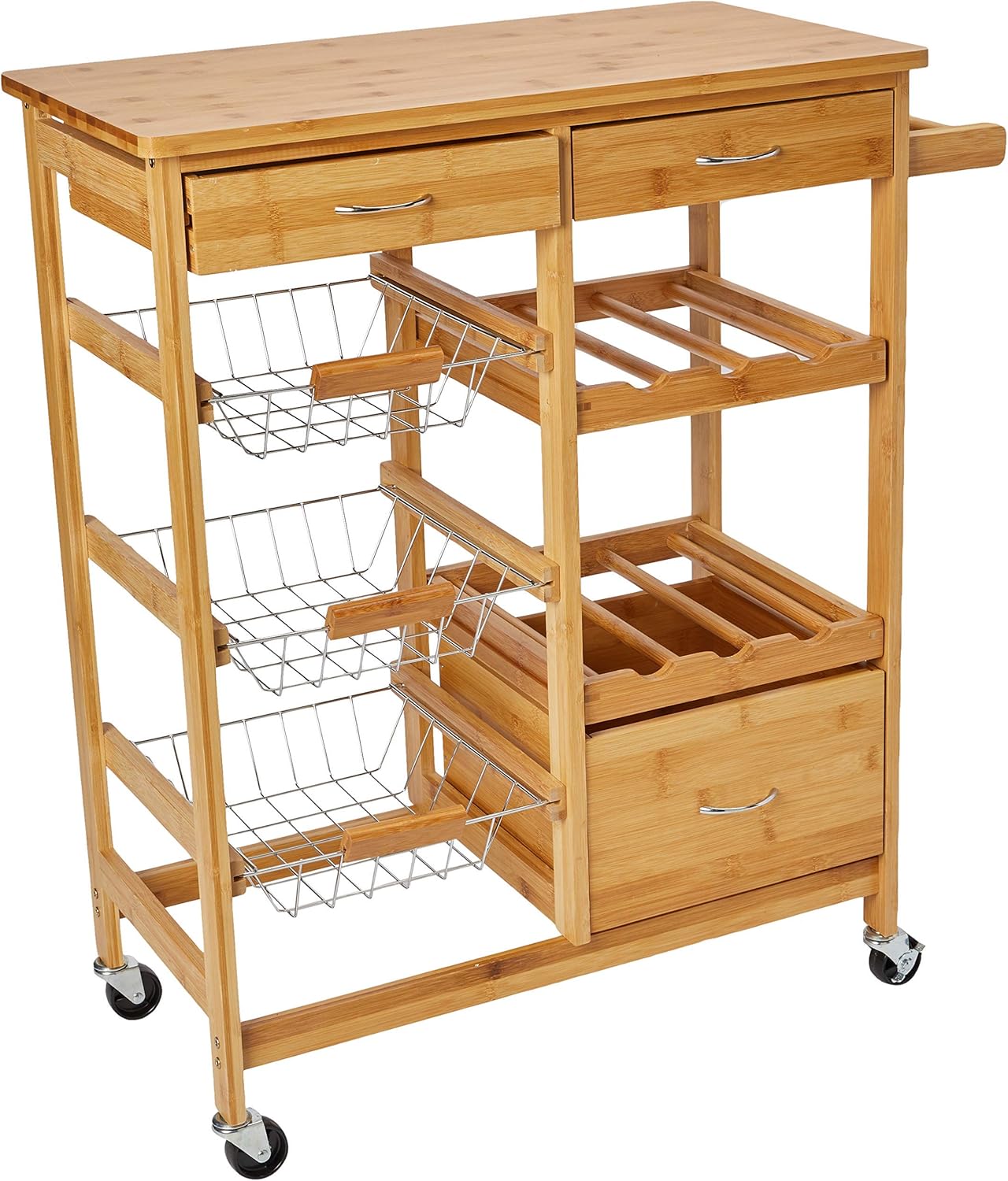 Tento kuchyňský vozík z ušlechtilého bambusu se v kuchyni stane o něco větším úložným prostorem a pracovní plochou. Kromě praktického a snadno čistitelného povrchu má vozík dvě další police s místem až pro šest lahví. Má také tři velké přední koše a tři praktické zásuvky. Čtyři plně pohyblivá a robustní kola se postarají o to, aby stroj neuhnul z cesty a dvě integrované parkovací brzdy jej v případě potřeby udrží pevně na místě. Instalace je rychlá a jednoduchá.