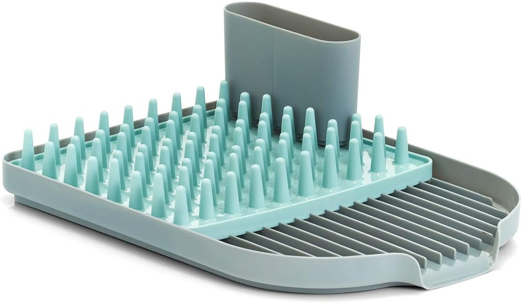Díky dvoubarevnému odkapávači nádobí je mytí dětskou hrou i v menších kuchyních. Díky tyrkysovému držáku a košíku na příbory si vše najde své místo. Drážky na šedém podstavci zajišťují, že se odkapávající voda optimálně shromažďuje a nádobí může nerušeně schnout. Všestranný odkapávač je vyroben z robustního plastu v šedé a tyrkysové barvě.