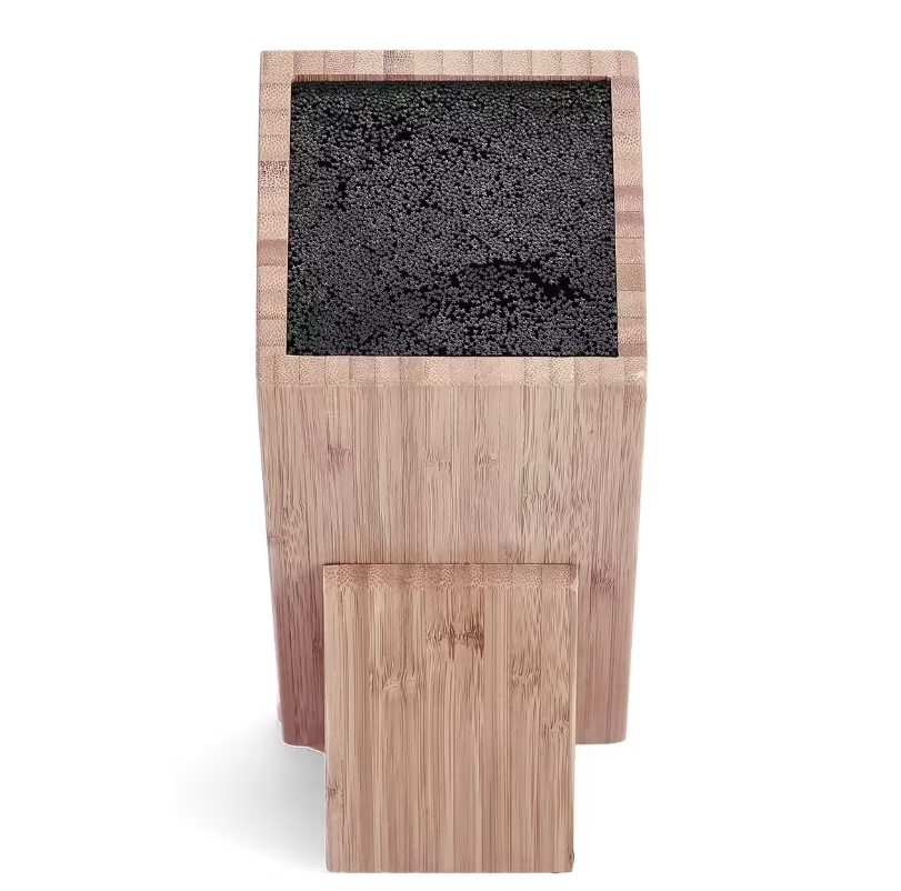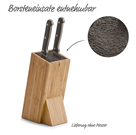 Tento vysoce kvalitní bambusový stojan na nože je ideálním řešením pro uložení vašich kuchyňských nožů. Ušetří vám starosti s hledáním nožů a ochrání jejich ostré čepele. Díky svému elegantnímu designu vypadá stojan skvěle v každé kuchyni a zabírá jen velmi málo místa. Gumové nožičky zajišťují bezpečné postavení.