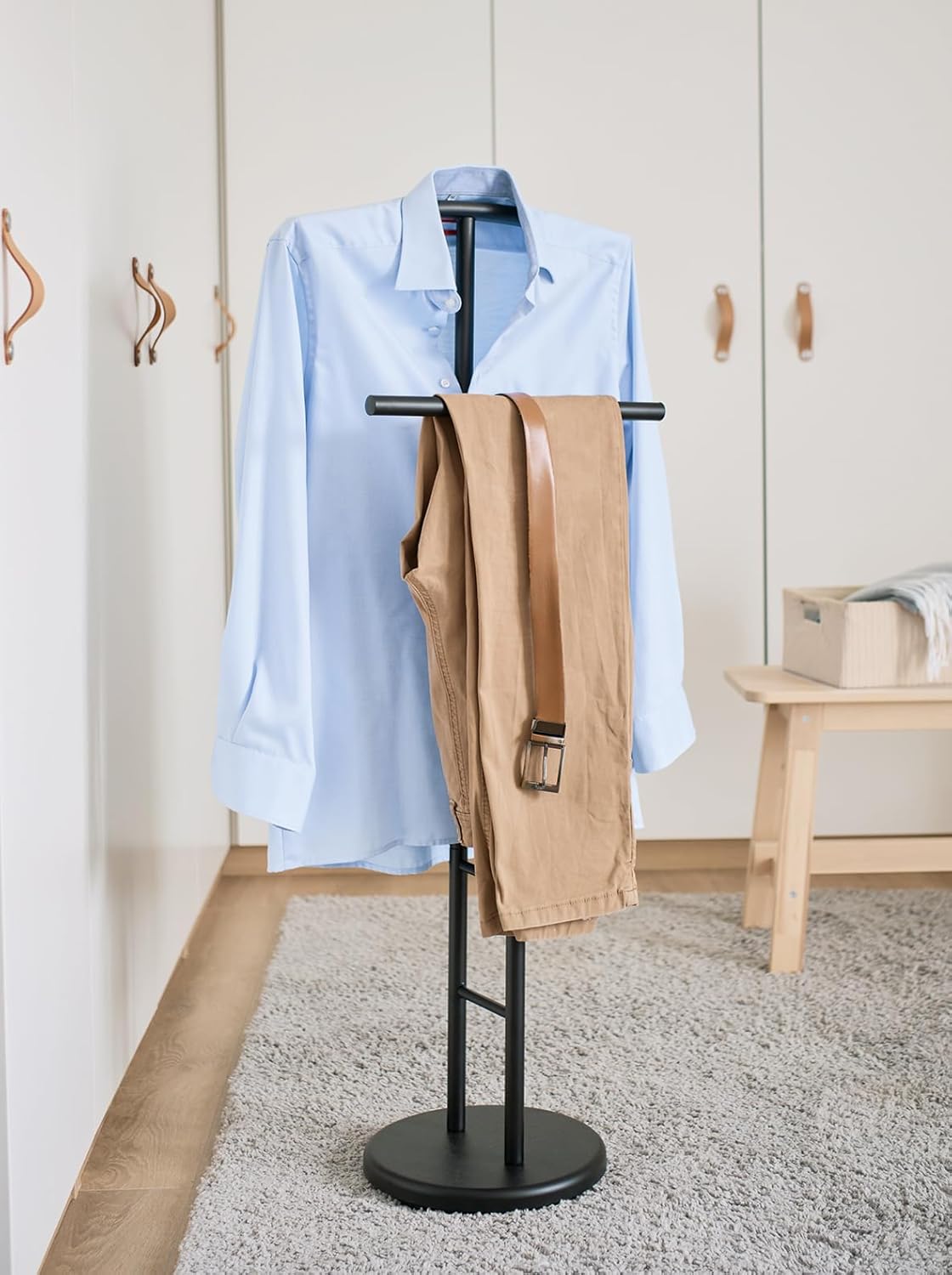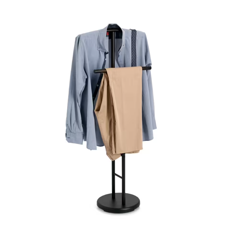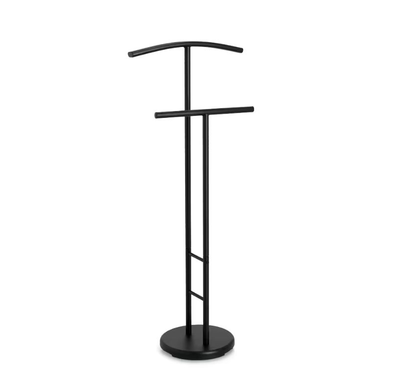 Tento praktický kovový stojan v moderní černé barvě kombinuje funkčnost a styl. Díky dvěma úložným tyčím nabízí dostatek prostoru na oblečení a doplňky, zatímco kulatá základna zajišťuje stabilitu. Tento elegantní pomocník pro každodenní použití se perfektně hodí do ložnic nebo šaten a je nezbytností pro každého, kdo si cení pořádku.