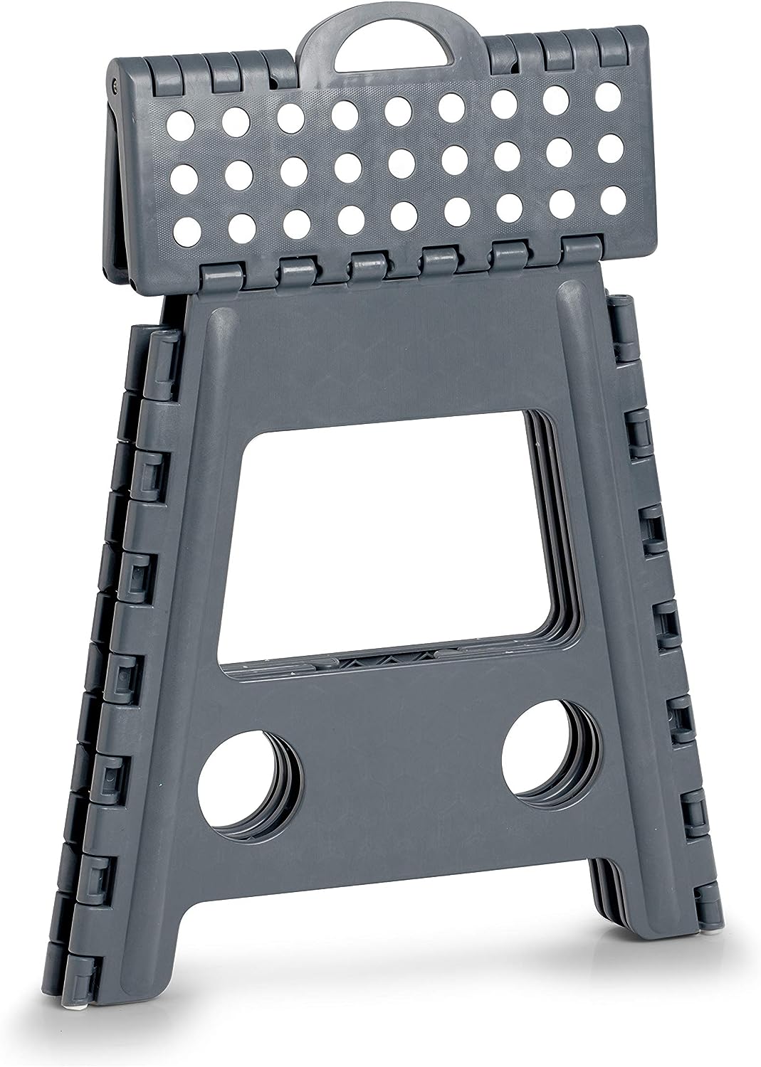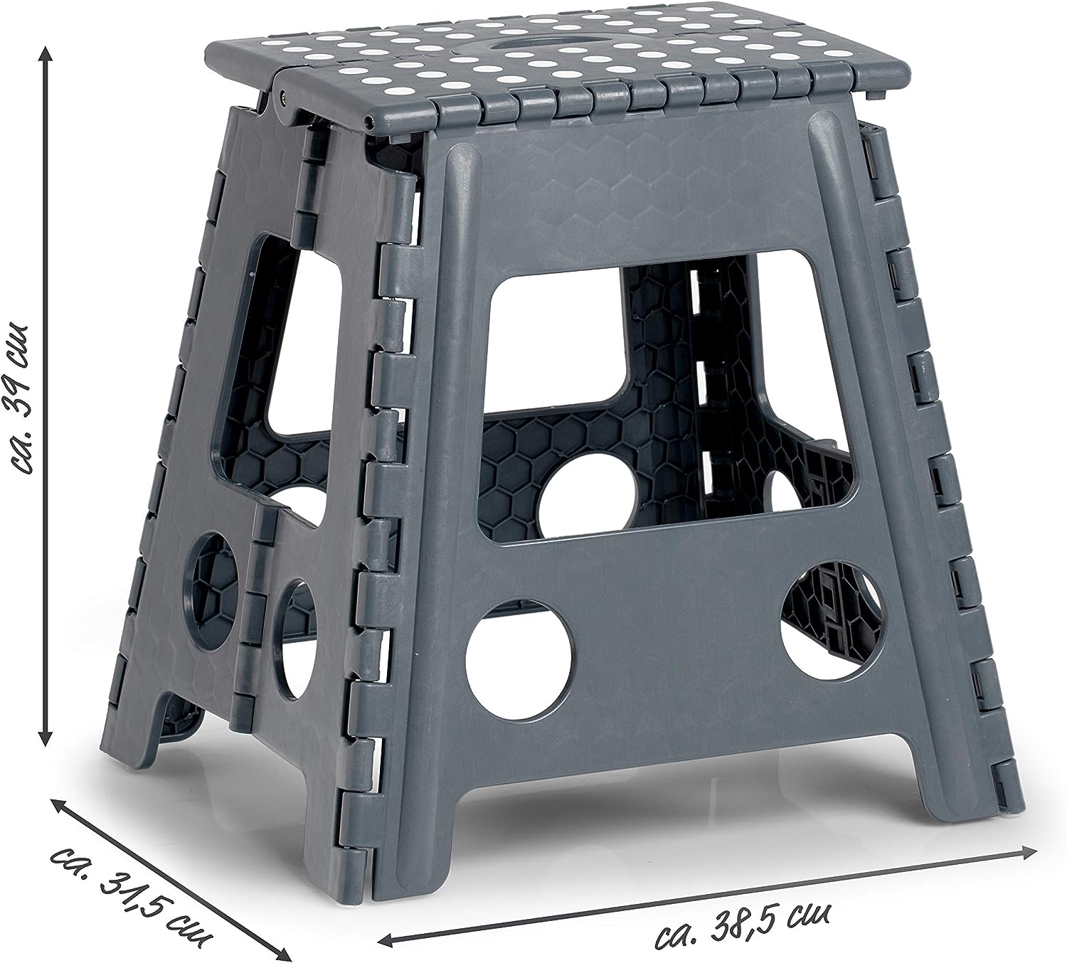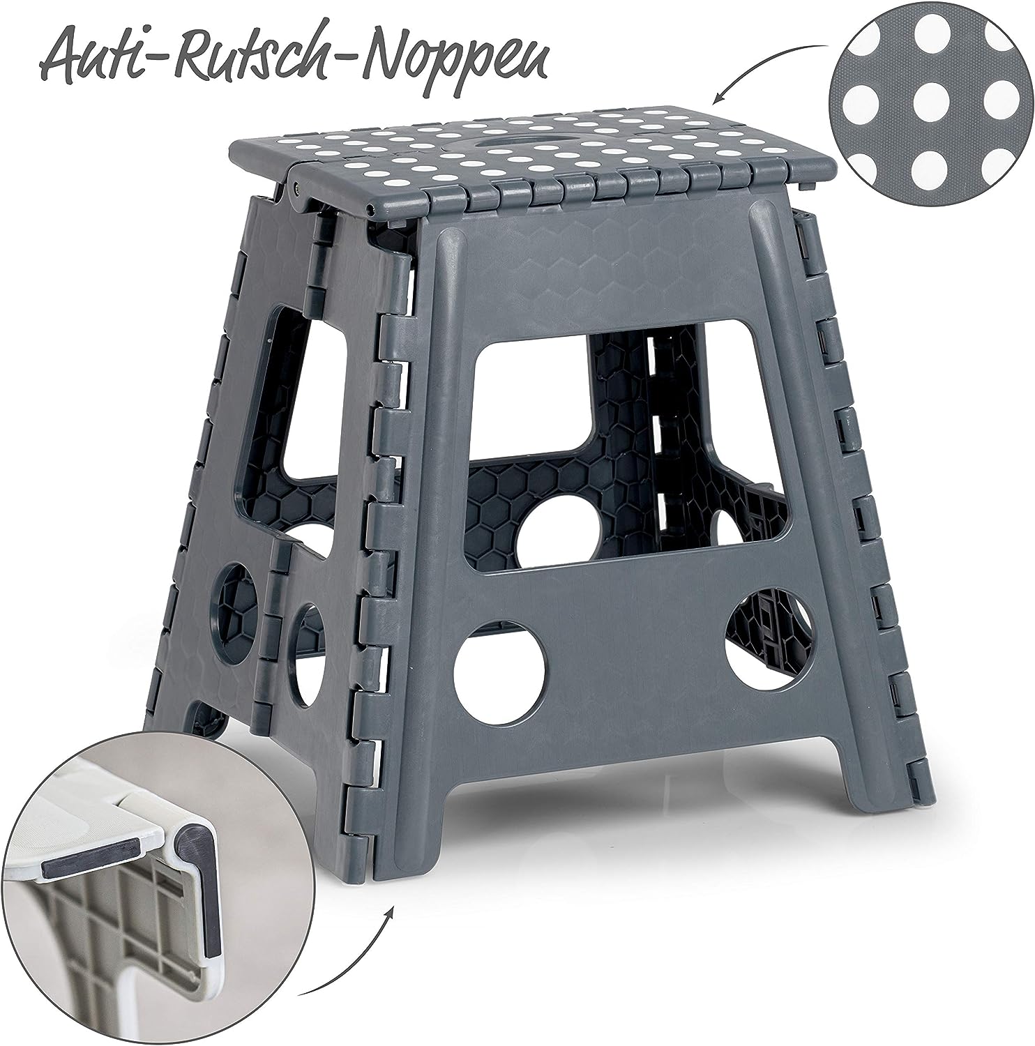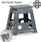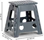 Skládací a prostorově úsporná, to jsou jen dvě z pozitivních vlastností skládací stoličky. Povrch stupátka je protiskluzný, spodní část díky příslušnému pogumování bezpečně drží na podlaze. Skládací stolička potřebuje malý prostor pro skladování. Stolička je vyrobena z vysoce kvalitního plastu, který vydrží zatížení až 150 kg. Skládací stolička by měla být používána pouze vsedě.