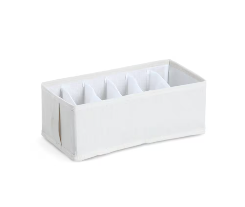 Tato strukturovaná úložná krabice se 6 přihrádkami je praktickým pomocníkem do vašeho šatníku. Její nastavitelné přihrádky umožňují přehledné uspořádání ponožek nebo doplňků. Díky zesíleným bočnicím nabízí výjimečnou stabilitu a po použití ji lze složit naplocho pro úsporu místa. Doplňte svůj úložný systém odpovídajícími krabicemi v jiných velikostech a tvarech.